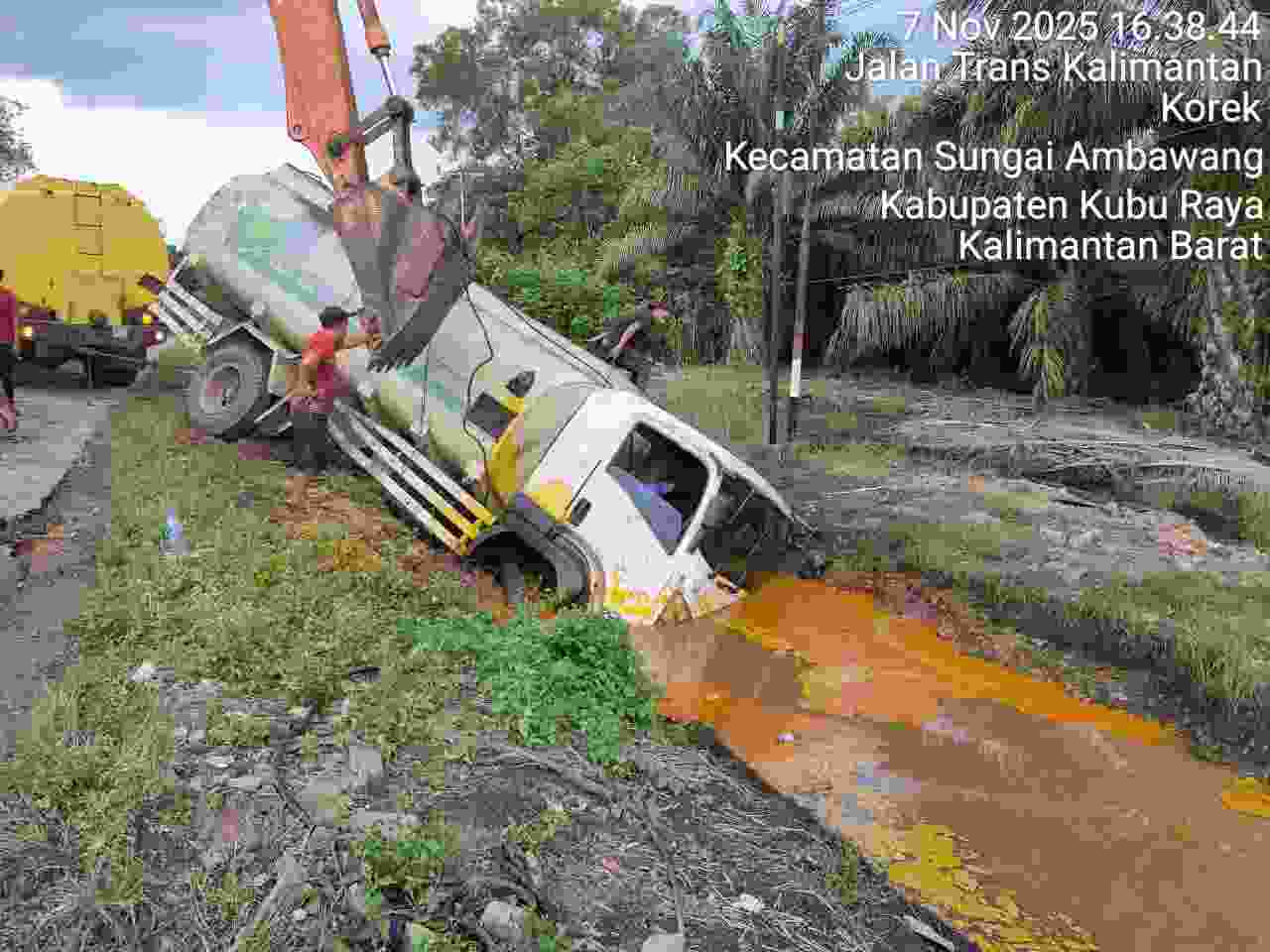Sebuah mobil tangki pengangkut Crude Palm Oil (CPO) dengan nomor polisi BK 8877 EJ, yang diketahui melaju dari arah Ketapang menuju Mempawah, mengalami kecelakaan tunggal dan terguling di Jalan Trans Kalimantan, tepatnya di Desa Korek, Kecamatan Sungai Ambawang, Kabupaten Kubu Raya, Kalbar, Jumat (7/11). Pengangkatan mobil sekitar pukul 15.00 Wib. Tidak ada tampak polisi berjaga jaga saat upaya pengangkatan mobil CPO tersebut.