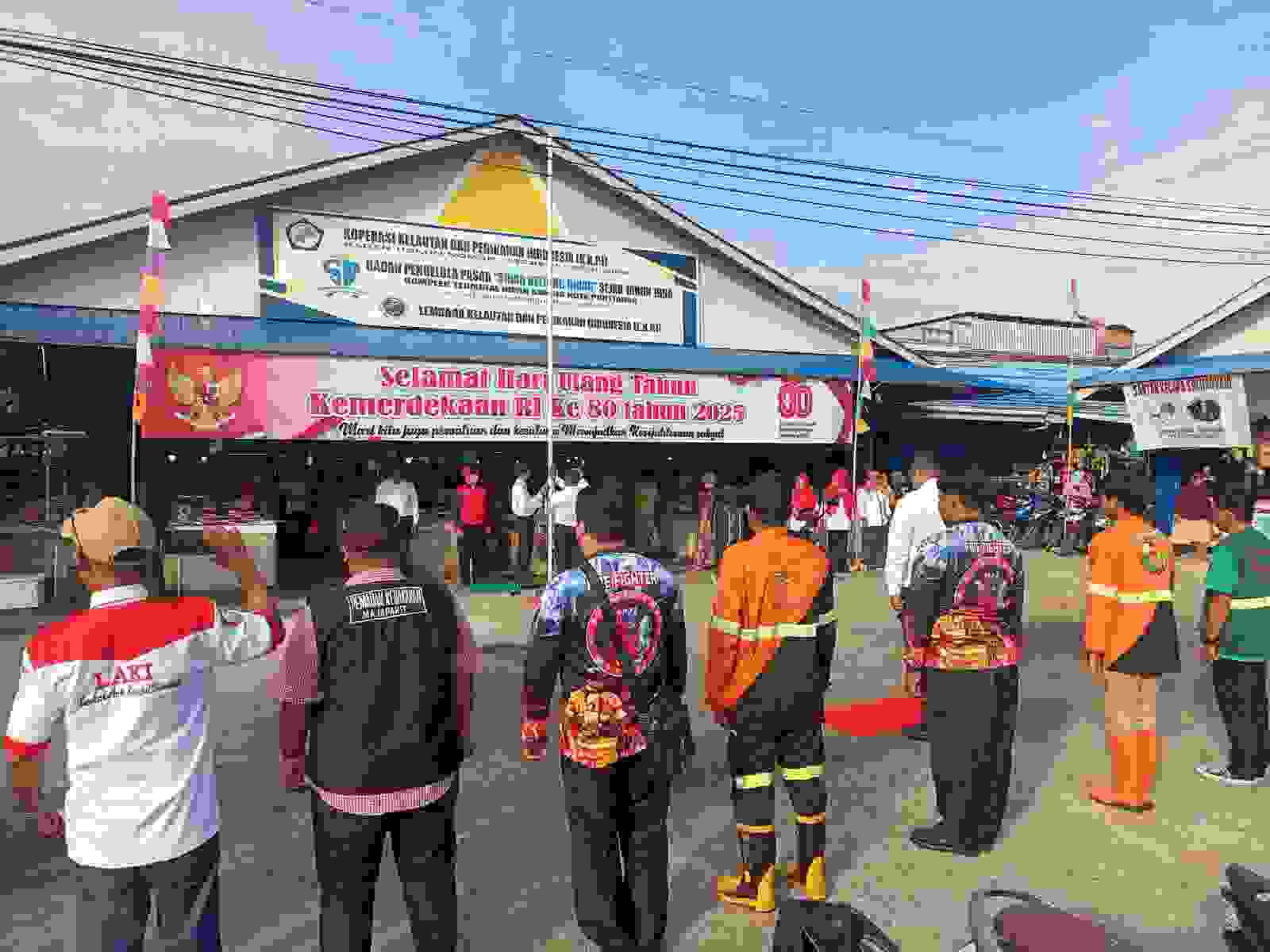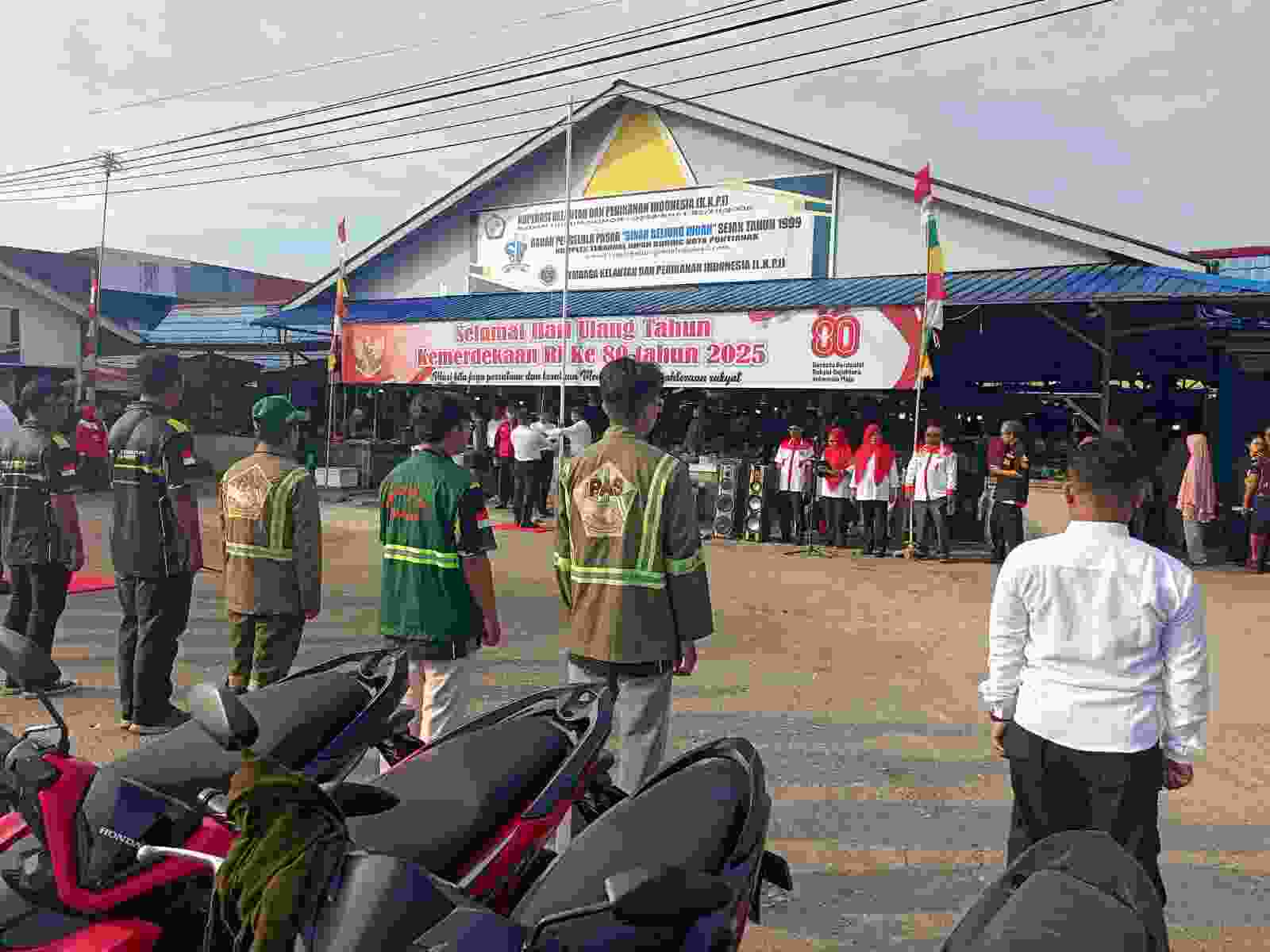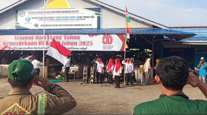 Sekelompok warga dari berbagai profesi, mulai dari pedagang pasar, tukang parkir, petugas kebersihan, pemadam kebakaran, hingga masyarakat sekitar, bersatu dalam sebuah upacara kemerdekaan yang digelar di halaman parkir Pasar Nipah Kuning, Pontianak.