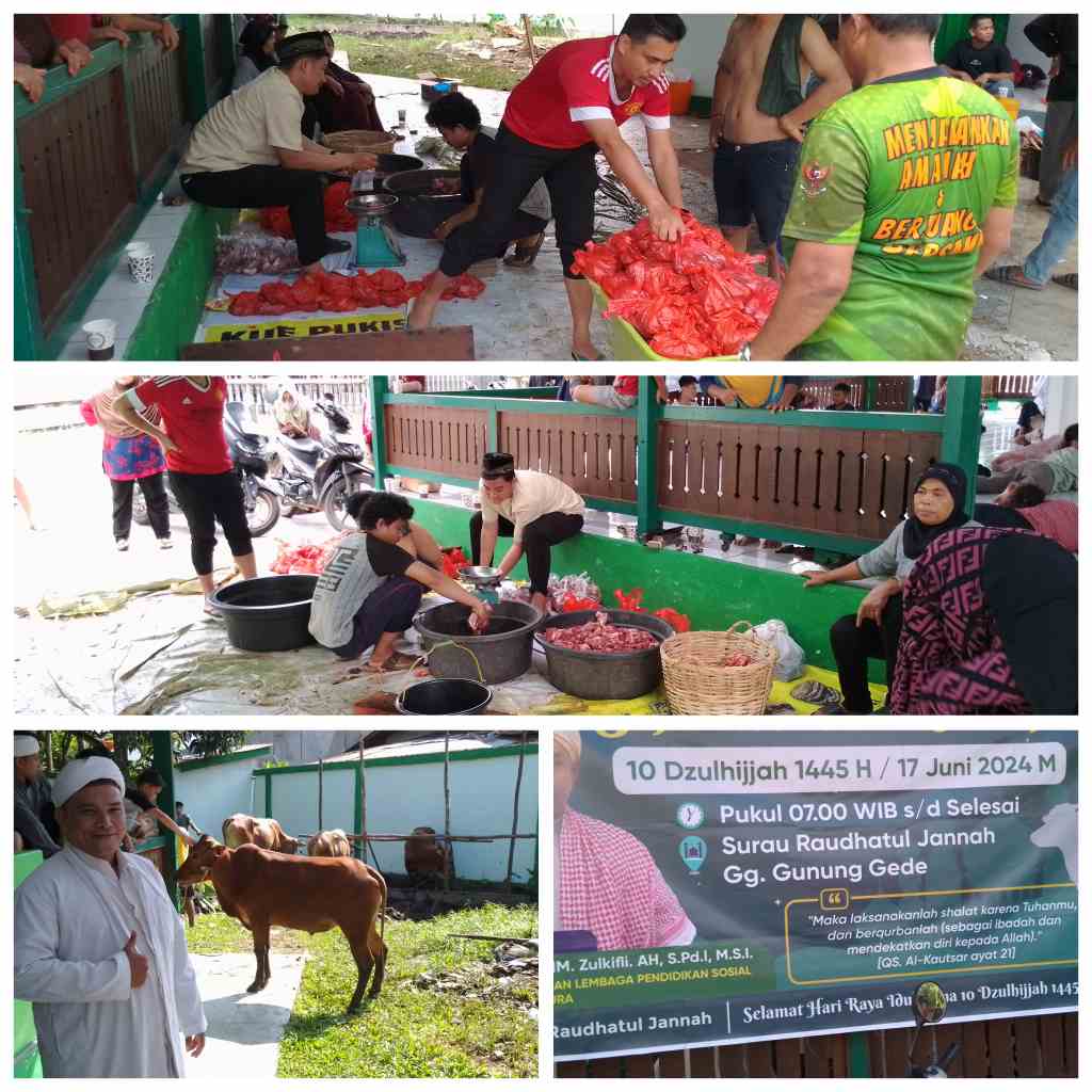 Surau Raudhatul Jannah Gg.Gunung Gede Pontianak Barat usai melaksanakan sholat ied Idul Adha 10 Dzulhijjah 1445 H / 17 Juni 2024 M menggelar penyembelihan dan pembagian hewan qurban sapi dan kambing.