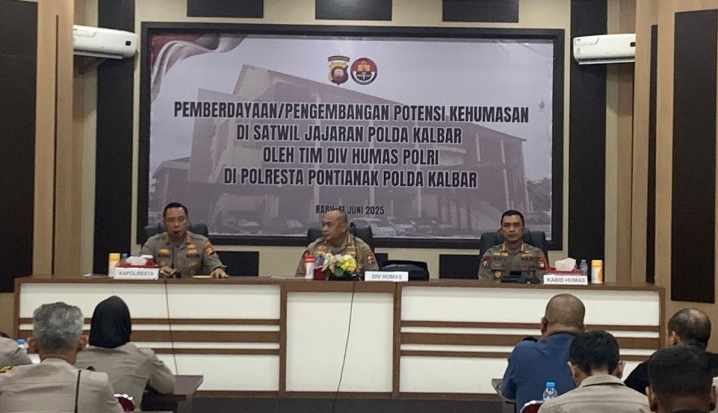 Pontianak, Polda Kalbar – (13/6/2025) Tim dari Divisi Humas Polri menggelar kegiatan Pemberdayaan dan Pengembangan Potensi Kehumasan Tingkat Satuan Wilayah (Satwil) yang dilaksanakan di Aula Polresta Pontianak, Rabu (11/6/2025).