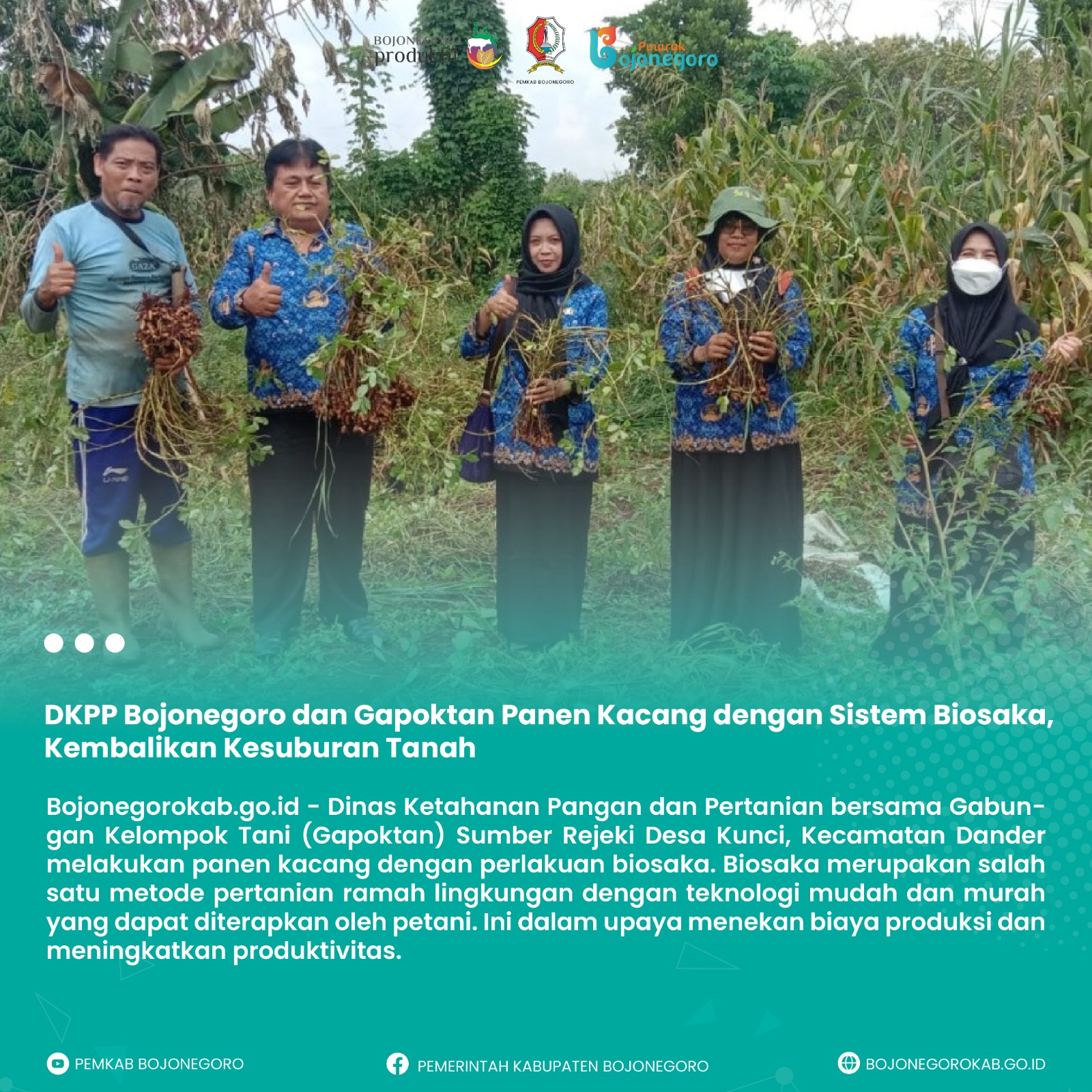 Dinas Ketahanan Pangan dan Pertanian bersama Gabungan Kelompok Tani (Gapoktan) Sumber Rejeki Desa Kunci, Kecamatan Dander melakukan panen kacang dengan perlakuan biosaka. Biosaka merupakan salah satu metode pertanian ramah lingkungan dengan teknologi mudah dan murah yang dapat diterapkan oleh petani. Ini dalam upaya menekan biaya produksi dan meningkatkan produktivitas.