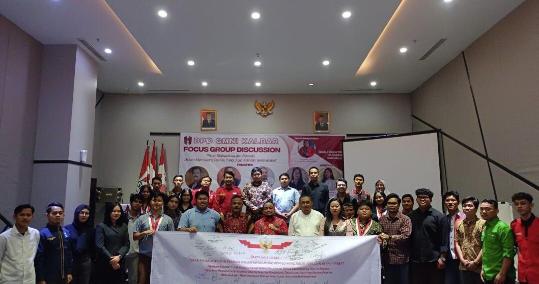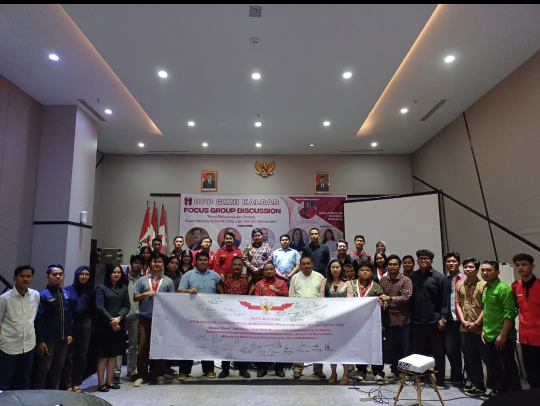 DPD GMNI KALBAR (Dewan Pengurus Daerah Gerakan Mahasiswa Nasional Indonesia) berkolaborasi bersama Akademisi Universitas Tanjungpura, Wakil Dekan Fakultas Hukum Universitas Muhammadiyah Pontianak, KPU Provinsi Kalimantan Barat dan Bawaslu Provinsi Kalbar melaksanakan agenda Focus Group Discussion yang bertemakan “Peran Mahasiswa dan Pemuda Dalam Mendukung Pemilu Yang Jujur, Adil, dan Bermartabat”.