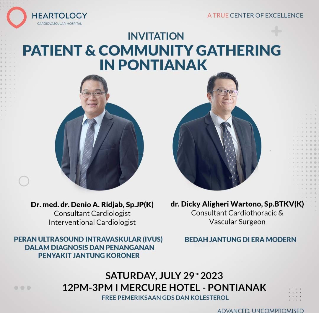 Pada hari Sabtu, tanggal 29 July 2023, Sabtu Siang, dari jam 12.00 s/d 15.00 Hadir dua Dokter Spesialis penyakit jantung dan pembuluh darah, serta ahli bedah jantung era modern hadir dan mengadakan seminar sehari gratis dan pemeriksaan darah tidak perlu membayar, bagi warga kota Pontianak pada Hotel Mercure, Jln. Ahmad Yani, Pontianak.