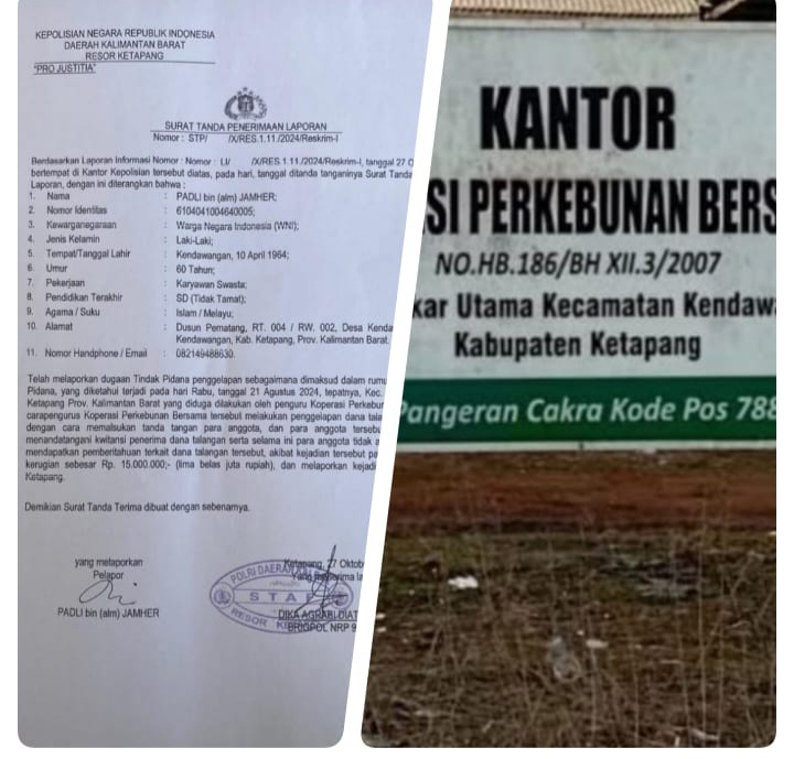 Puluhan anggota Koperasi Perkebunan Bersama Kecamatan Kendawangan melaporkan pengurusnya (Ketua, Sekretaris, Bendahara) ke Polres Ketapang terkait dugaan penggelapan dana talangan, Minggu 27 Oktober 2024.