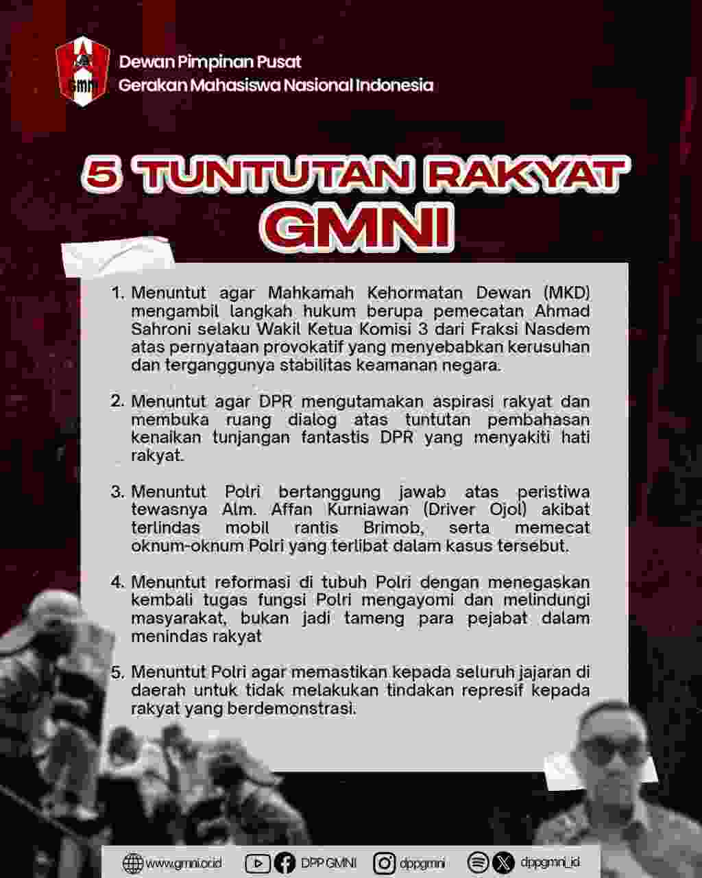 3. Menuntut Polri bertanggung jawab atas peristiwa tewasnya Alm. Affan Kurniawan (Driver Ojol) akibat terlindas mobil rantis Brimob, serta memecat oknum-oknum Polri yang terlibat dalam kasus tersebut.