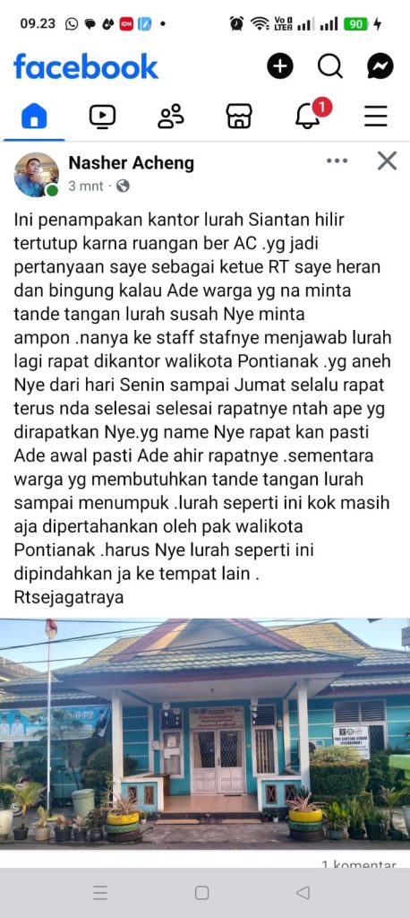 Dalam unggahan tersebut, ia menyebutkan bahwa kantor lurah selalu tertutup karena menggunakan pendingin ruangan (AC), sehingga warga kesulitan mengetahui apakah layanan tersedia atau tidak. Yang menjadi sorotan, permintaan tanda tangan dari Lurah kerap kali tak terpenuhi karena alasan sang lurah sedang “rapat di Kantor Wali Kota Pontianak”.“Dari hari Senin sampai Jumat, jawabannya selalu rapat. Apakah rapat tak pernah selesai? Namanya rapat pasti ada awal dan ada akhir. Sementara warga menumpuk menunggu tanda tangan yang tak kunjung diberikan,” keluh Ketua RT yang dikenal dengan nama Nasher Acheng.