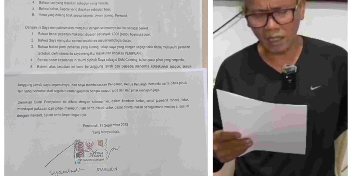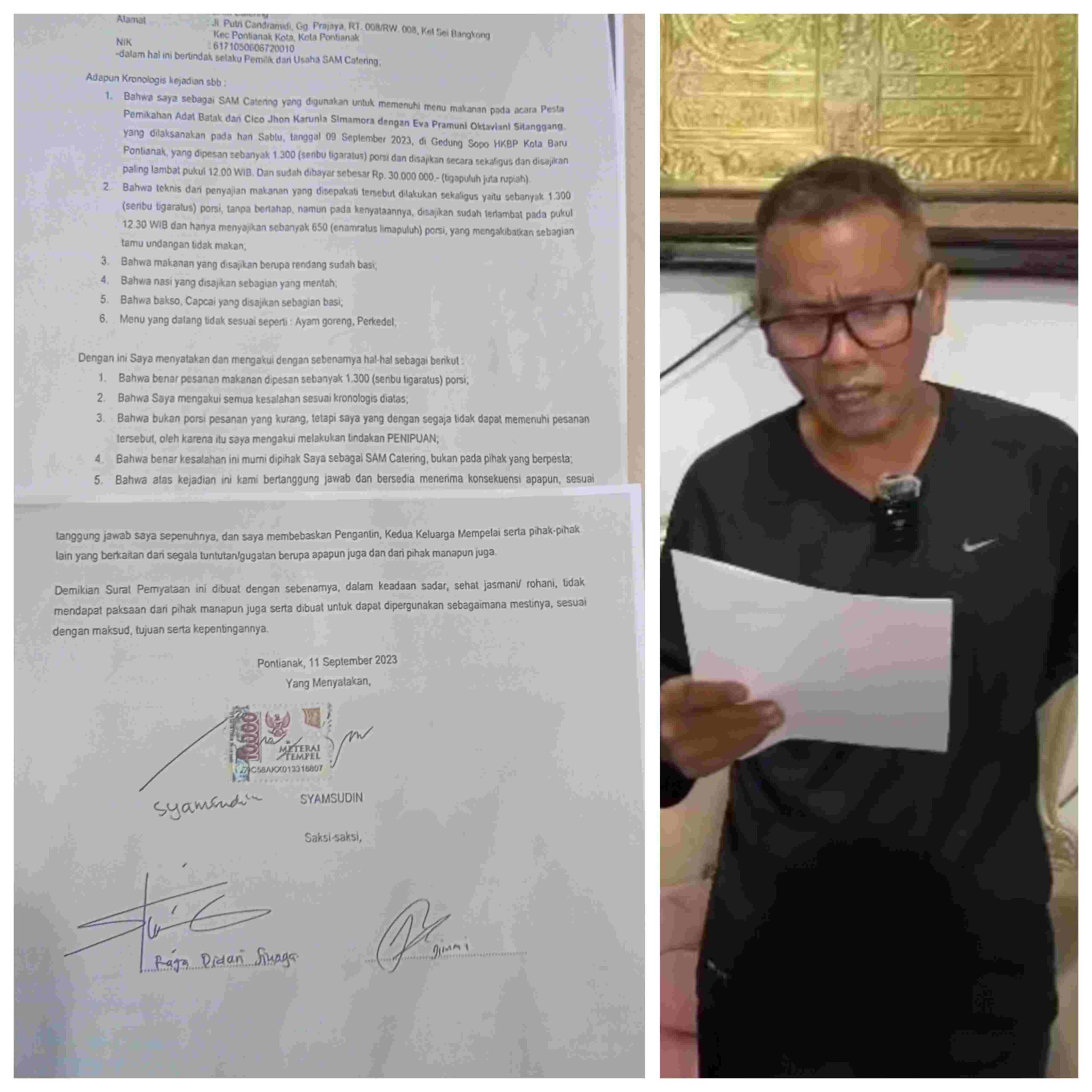 Syamsudin Dalam surat pernyataan ditandatanganinya yang dibuat pada tanggal 11 September 2023 diatas materai disaksikan oleh Raja Didan Sinaga dan Jimmi dia mengakui SAM Catering yang dikelolanya sesuai perjanjian akan memenuhi menu makanan pada acara pesta pernikahan adat batak dari Cico Jhon Karunia Simamora dengan Eva Pramuni Oktaviani Sitanggang yang dilaksanakan pada Sabtu (9/9/23) digedung Sopo HKBP Kota Baru Pontianak.