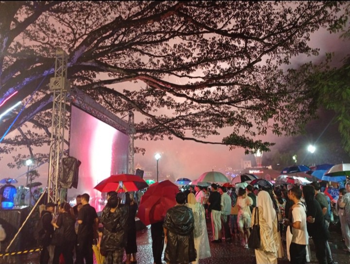 Perayaan malam pergantian tahun 2025 di Waterfront Kuching berlangsung dengan penuh kemeriahan, meskipun hujan turun sepanjang acara.