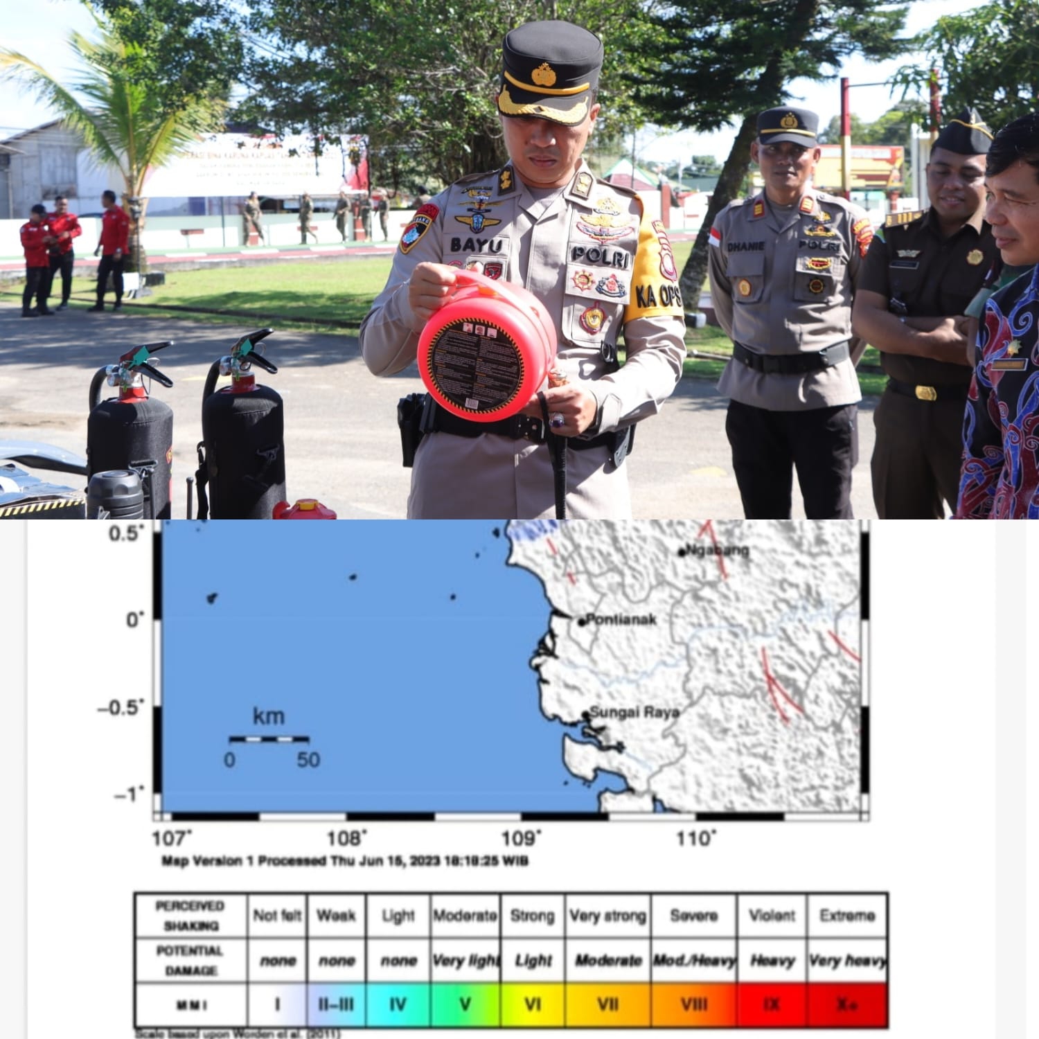Kapolres Bengkayang AKBP Dr. Bayu Suseno, S.H., S.I.K., M.M., M.H. dihubungi melalui pesan Whatsapp hari ini , Kamis sore (15/06/2023) membenarkan adanya getaran gempa magnitudo. Namun tidak disebutkan kekuatan gempa berapa Skala Richter (SR).