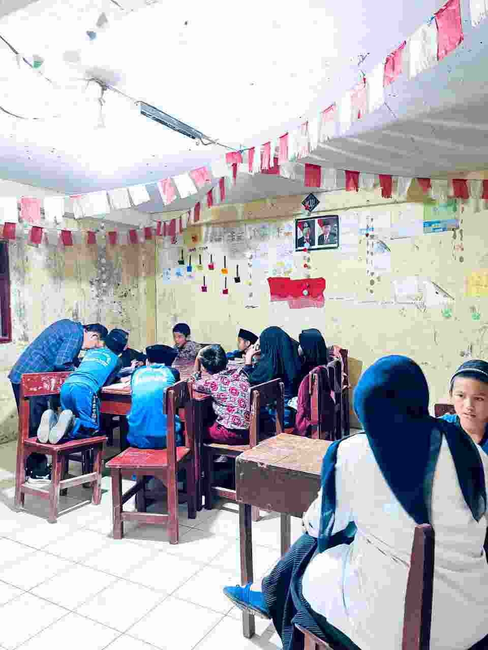 Di balik dinding kelas yang mulai rapuh dan meja-meja penuh coretan, semangat belajar tak pernah surut. Sejumlah anak dengan seragam sederhana duduk rapi, menyimak penjelasan dari seorang guru yang dengan sabar membimbing mereka.