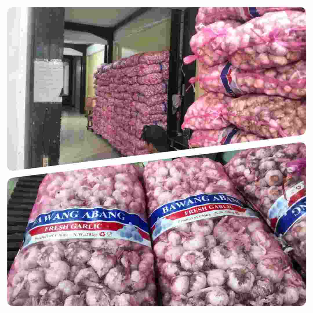 Diduga bawang putih impor ilegal dengan merek Fresh Garlic asal Tiongkok beredar bebas di Pasar Flamboyan, Kota Pontianak, Kalimantan Barat.