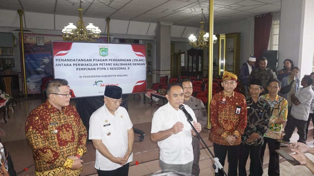 Manajer Kebun Kalibakar Pancursari PTPN I Regional 5, Wibi Rikananto, bersama Kepala Desa Bumirejo, Malang, Sugeng Wicaksono, mewakili petani penggarap tanah di Desa Bumirejo, melakukan penandatangan piagam perdamaian/kesepakatan untuk mengakhiri konflik agraria yang telah terjadi selama 26 tahun di Pendopo Bupati Malang pada Kamis, 4 April 2024.