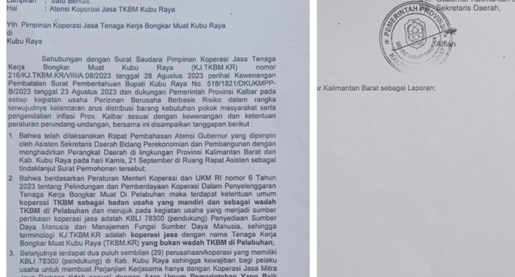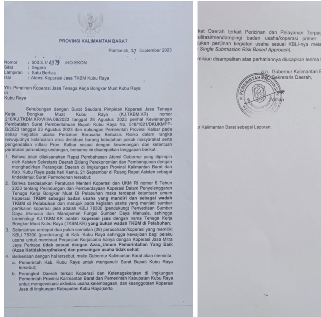 Surat Pemprov Kalbar An. Gubernur Kalbar perihal Atensi Koperasi Jasa TKBM Kubu Raya tersebut menjawab surat