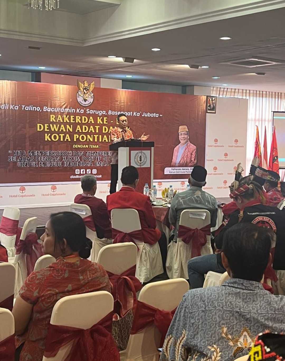 Acara ini seperti yang disampaikan Yohanes Nenes mengusung tema “Memperkokoh dan Mempererat Hukum Adat Selaras dengan Hukum Positif di Kota Pontianak Menuju Indonesia Emas 2045.”